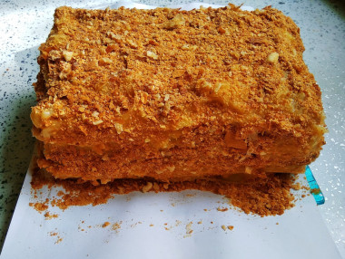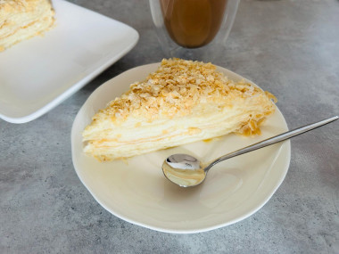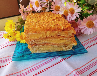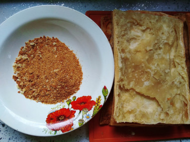 Люблю слоеные тортики, типа Наполеона. Для этого торта взяла упаковку бездрожжевого теста весом в один килограмм. Всего было 4 пласта. Я их все и испекла. При этом количество крема прибавила в 1,5 раза. Как раз хватило. Коржи поднялись хорошо, но получилось разрезать их только на две части каждый, было много пустот. Замечу, что я выложила тесто на обычный пергамент, но в процессе выпечки оно прилипло. Думаю, надо все же смазать тонким слоем масла или использовать силиконовый коврик. Пергамент я легко сняла, так же как делаю это с пастилой. Перевернула коржи вверх пергаментом и при помощи силиконовой кисточки смазала поверхность обычной водой. Через пару минут пергамент отошел. В креме я заменила муку на картофельный крахмал, просто люблю заварной крем погуще) Крошки смолола в блендере. А для того, чтобы при обсыпке они не сыпались всюду, подложила на блюдо листочки бумаги, которые потом убрала. Сложила все в один торт, хотя, наверное, надо было разделить на два. Уж очень высокий получился, не очень удобно брать кусочки) Пропитывался торт всю ночь в холодильнике. На утро он стал мягким и очень вкусным) Я люблю такие тортики, да и дети смели все это за полдня) Спасибо за рецепт!