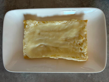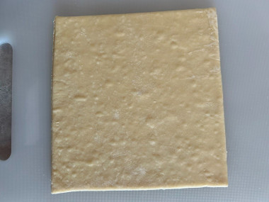 Как сделать бюджетный торт? Подготовьте продукты. Тесто возьмите именно бездрожжевое, оно не так сильно поднимается и имеет более хрустящую структуру, напоминающую коржи Наполеона. Тесто надо заранее разморозить. Самый лучший способ сделать это — положить тесто из морозилки в холодильное отделение. При таком способе тесто растает очень деликатно и будет лучше себя вести при выпечке. Этот рецепт ориентирован на стандартное магазинное тесто из двух пластов.