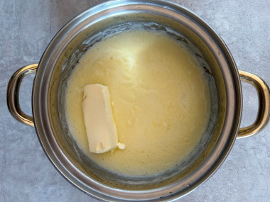 Когда основа остынет, но все еще будет теплой, положите в нее сливочное масло. Так как торт бюджетный, то и масла в крем идет совсем немного, что никак не сказывается на его вкусе. Единственное, его не надо взбивать, как обычный заварной крем. Достаточно просто смешать масло с основой. В теплом состоянии масло очень хорошо вмешивается.