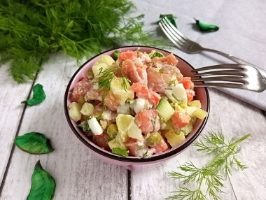 Сделала к ужину необычное оливье с красной рыбой. До этого и не знала, что можно заменить мясо или колбасу на рыбу). Оказалось, что это очень вкусно!