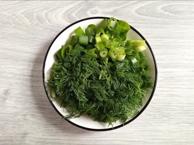 Петрушку помойте, хорошо обсушите, чтобы в салат не попала лишняя влага. Петрушку мелко порубите. Вместо петрушки можно взять укроп или зеленый лук, а можно зелень вообще не добавлять. Ориентируйтесь на свои вкусовые предпочтения.