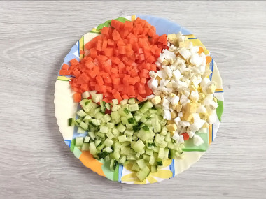 Остывший картофель очистите от кожицы, нарежьте кубиками. Морковь аналогично очистите от кожицы, нарежьте такими же кубиками. Остывшие яйца очистите от скорлупы, так же нарежьте. Огурец помойте, обсушите, нарежьте кубиками. Если у огурца грубая кожица, ее можно срезать и нарезать овощ без кожицы.