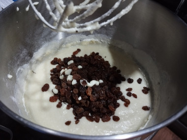 Добавьте к массе промытый и подсушенный на бумажном полотенце изюм. Чтобы изюминки равномерно распределялись по тесту и не липли друг к другу, их можно обвалять в муке, особенно если у вас липкий изюм. У меня не такой, поэтому я этого не делала.