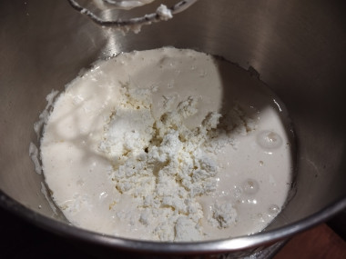 Возьмите третью часть муки (заранее просеянной), добавьте к ней чайную ложку разрыхлителя, также добавьте к тесту и на небольшой скорости взбейте. Делайте это аккуратно, чтобы тесто не разбрызгивалось. Не включайте сразу высокую скорость, а лопасти миксера погружайте в массу полностью (если это возможно).