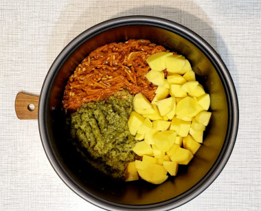 На режиме *выпечка* спассеровала лук и морковь, добавила томатную пасту, перловку, измельченные соленые огурцы и картошку. Залила горячей фильтрованной водой, и выставила режим *тушение* 1 час.