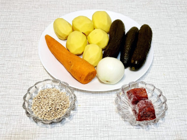 Как сварить рассольник с тушенкой и перловкой? Подготовьте все необходимые продукты. Основа этого супа - соленые огурцы. Их лучше взять покислее и посолонее, чтобы вкус супа был насыщеннее. Тушенка подойдет из любого вида мяса. Главное, в составе тушенки не должно быть ничего кроме мяса, соли и специй, мяса должно быть не меньше 80%. Из специй выбирайте любую смесь для мяса.