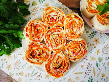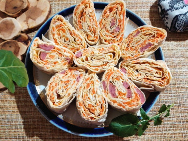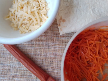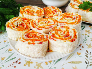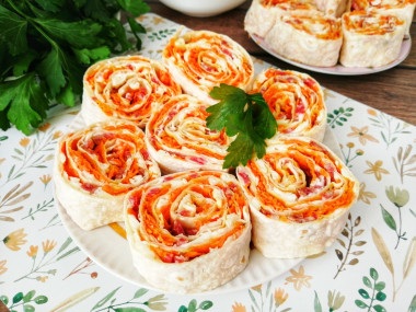 Сделала простую и вкусную закуску с корейской морковью и лавашем рулет.