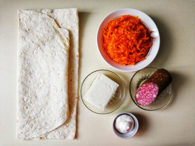 Как сделать закуску с корейской морковью и лавашем? Подготовим все ингредиенты. Вместо копченой колбасы можно взять полукопченую колбасу, тогда рулет получится нежнее. Плавленый сыр можно заменить обычным твердым сыром.