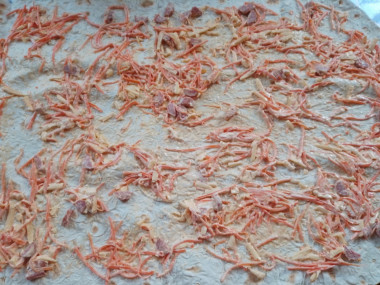 Приготовление рулета начнем с приготовления начинки. Сыр потрем на мелкой терке или помнем вилкой. Колбасу нарежем мелким кубиком. Корейскую морковь при необходимости измельчим. Все ингредиенты соединим в глубокой миске, заправим майонезом и хорошо перемешаем – начинка готова.