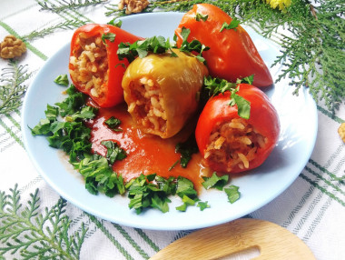 Итак, готовые фаршированные перцы просто чудо! Я даже не ожидала, что сырой рис может стать таким сочным и нежным. Видимо соус этому поспособствовал. Томат внутри перчика сделал фарш очень сочным и вкусным, с небольшой кислинкой. Вообще перчики аппетитные и ароматные от сельдерея, душистого перца и лаврового листа. Нам очень понравилось! Дети сразу по пять штук съели) Настоятельно рекомендую всем попробовать такой вариант фаршированных перчиков! Мария, спасибо!