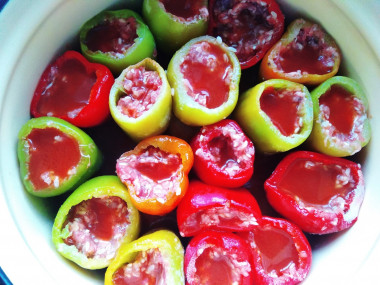 Столько вариантов фаршированного перца приготовила, но оказалось, что есть еще один способ) Я всегда рис отвариваю для фарша, а тут добавляется сырой. Переживала, что он не разварится, будет сырым и жестким. На самом деле получилось все на высшем уровне. Перцы у меня были замороженные, они были заранее почищены перед заморозкой, поэтому крышечек нет. Готовила сразу большую порцию, у нас в семье такие перчики любят, мало готовить не вариант) В фарш от себя добавила небольшую луковицу для сочности, пропустила ее вместе с мясом через мясорубку. Из мяса взяла свинину и жирную говядину пополам. Перчики начиняла фаршем не до конца, чтобы в процессе приготовления рису было куда разбухнуть, это оказалось правильным решением. Еще одна новинка для меня в рецепте: томатный соус наливается прямо в перчики. Я разливала его из мерного кувшинчика с носиком, это очень удобно. Остатки соуса вылила между перцами, соус немного подсолила. Черешков сельдерея не нашла, добавила листья. Мои перчики никак не хотели устанавливаться вертикально, ведь они были замороженными и скользили по дну кастрюли. Догадалась налить на дно немного кипятка, донышки растаяли и прекрасно установились. Можно взять на заметку)