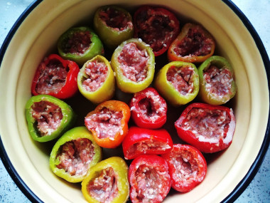 Всё искала рецепты с именно таким классическим перцем! Фарш да и всё, ничего лишнего. Хотя везде по своему готовят. Также везде рис отваривали, а мы сырой в фарш замешиваем, как и в самом рецепте. Опять же, как уже сказали ниже, не до краев наполняем перцы, а чтобы было место набухшему рису. Единственная проблема, с которой всегда сталкиваемся при готовке перцев - это уместить их в кастрюле..