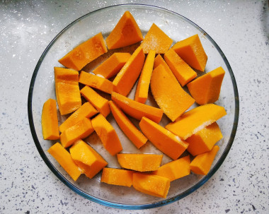 Тыкву очистите от семян. Подготовленный ломоть нарежьте крупными кусочками прямо с кожурой. Кожура защитит овощ от пригорания и прилипания к форме.