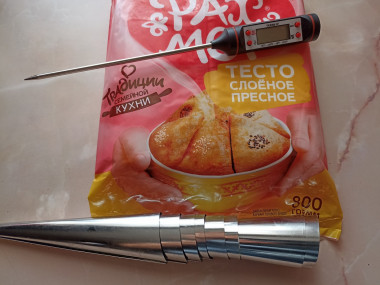 Как сделать слоеные трубочки с белковым кремом? Подготовьте необходимые ингредиенты. Можно использовать как покупное тесто, так и свое домашнее. Рецепты вы найдёте после последнего шага. Если тесто заморожено, то разморозите его при комнатной температуре.