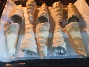 Тесто у меня было покупное слоеное дрожжевое (500 гр). Из него у меня получилось 14 рожков. Поскольку конусов для выпечки у меня всего шесть, то выпекала рожки в три захода. На выпекание у меня уходило по 25 минут: 15 минут на среднем уровне духовки и 10 минут на самом верхнем.