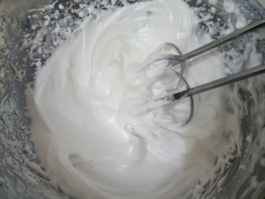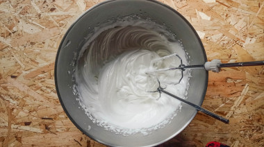 Яичный белок перелейте в глубокую чашу и взбейте на максимальной скорости миксера до пышной стабильной массы.