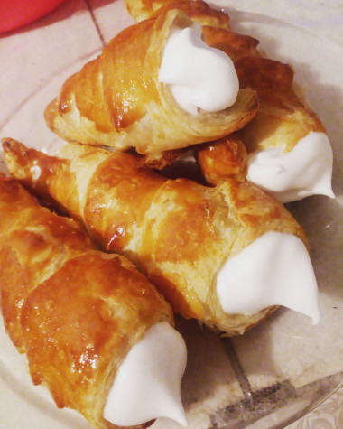 Слоеные трубочки с белковым кремом я готовила по большей части для мужа. Обычно у нас в магазинах продается выпечка со взбитыми сливками, а муж с такой начинкой не любит. Так что решила его порадовать вкусными трубочками.