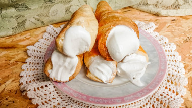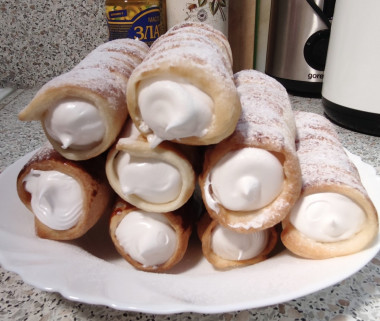 Я сделала формочки не в форме конуса. Полость внутри оказалась большевата, крема не хватило. Варила еще удвоенную порцию, оказалось много) В целом, все хорошо, в следующий раз будет еще лучше) Слоеные трубочки с белковым кремом прелесть!