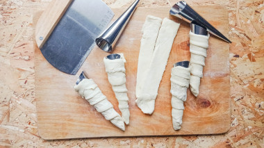 Немного раскатайте тесто и разрежьте его на полоски шириной по 2-2,5 сантиметра. Одного пласта 250 грамм теста хватает на 10 трубочек. Каждую полоску теста обмотайте вокруг конуса, начиная с широкой части. При необходимости тесто немного растягивайте. Обматывайте тесто так, чтобы оно шло немного внахлест.