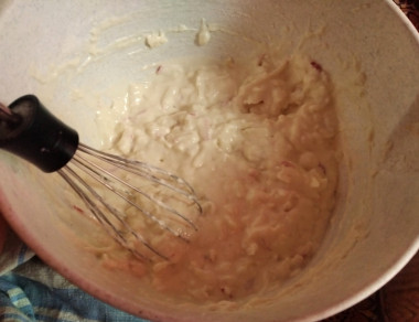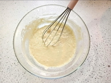 Тесто хорошо перемешайте, чтобы не было комочков. Тесто будет довольно густое, по консистенции как жирная сметана.