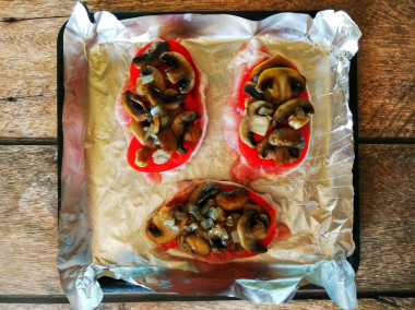 Кусок свинины разрезала на стейки, они у меня получились около 1,5 см толщиной. Кулинарного молотка под рукой не оказалось, поэтому воспользовалась ножом, отбивала стейки его обратной стороной. Затем посолила их и выложила на противень. Сверху положила нарезанные помидоры, на них обжаренные с луком шампиньоны. Запекала мясо в духовке 30 минут. Затем на каждый стейк положила по две-три чайные ложки сметаны и натертый сыр. Вернула мясо в духовку и подержала его там еще 10 минут.