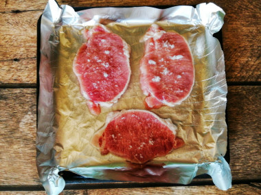 Затем мясо посолите и посыпьте специями на свой вкус. В качестве специй я беру немного молотого перца.
