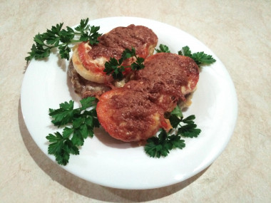 Я готовила мясо с луком, положив его под помидоры. Сыр был "Российский", натёрла его на средней терке. Запекала свинину в форме, смазав маслом. Мясо простояло 40 минут при 180 С, а затем до полного остывания духовки, как пишет автор. Получилась действительно хрустящая корочка.
