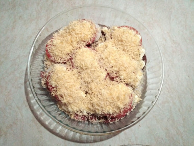 Посыпьте все тертым сыром. Поставьте мясо по-французски в разогретую до 180°С духовку на средний уровень примерно на 40 минут. Точное время зависит от особенностей вашей духовки. Сыр сверху должен подрумяниться.