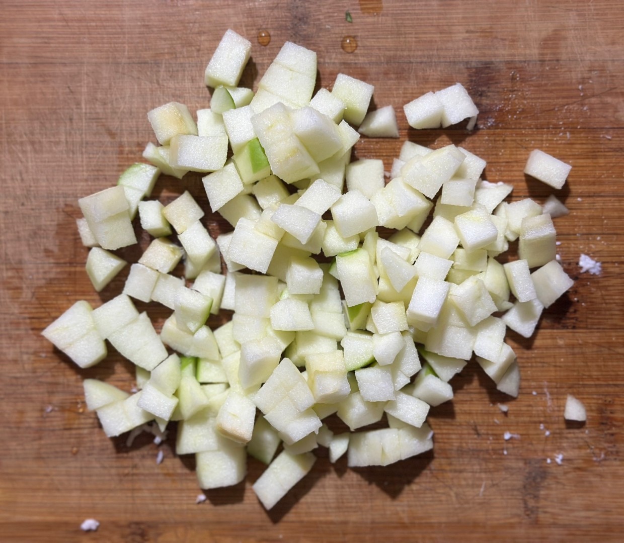 Яблоко нарежьте также на кубики — салат будет красиво и аккуратно смотреться, если нарезать все ингредиенты одинаковыми по размеру и форме кусочками. Если кожица у яблока очень грубая, то срежьте ее.Шаг 4: