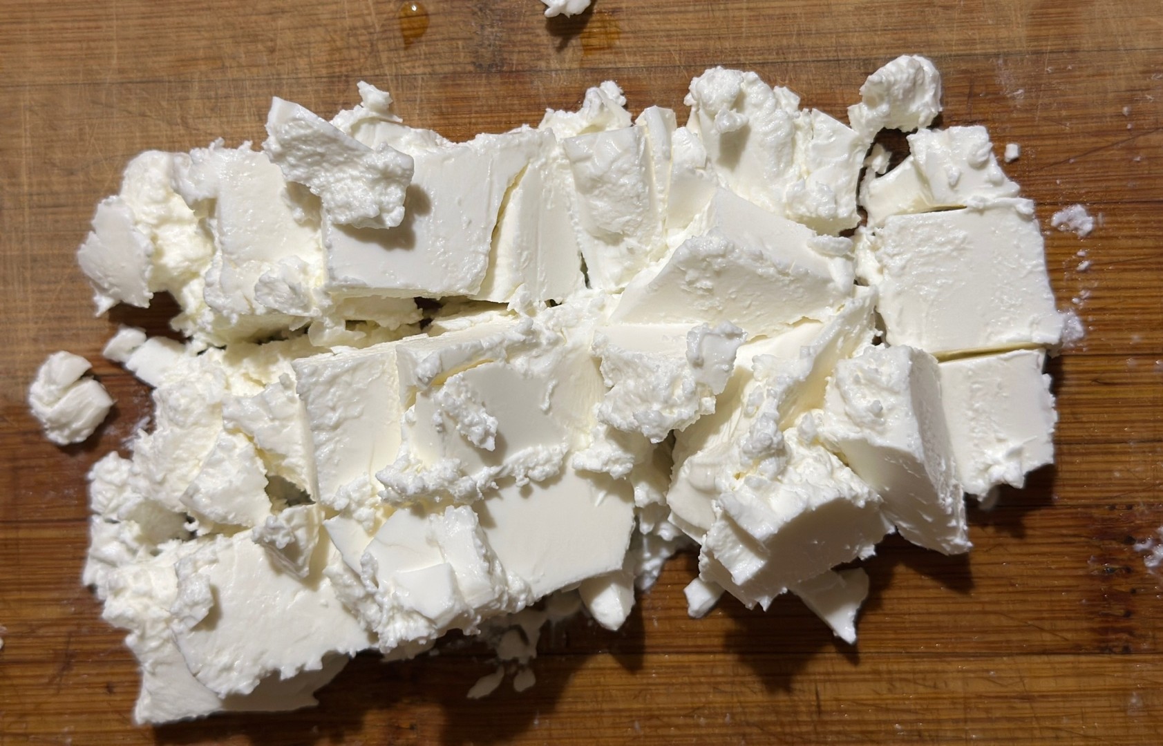 Сыр нарежьте на кубики такого же размера, что и яблоко. Я взяла адыгейский сыр, он немного пресноват. В следующий раз хочу добавить брынзу или фету, чтобы сделать вкус острее.Шаг 5: