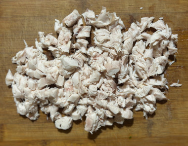 Куриное мясо предварительно отварите. Как варить куриную грудку? Доведите до кипения воду в кастрюле, опустите в нее филе. Добавьте соль. Варите курицу 30 минут при слабом кипении на небольшом огне. Затем огонь выключите и оставьте филе до полного остывания — таким способом вы добьетесь максимальной сочности. Остывшее филе обсушите и нарежьте кубиками.Шаг 3: