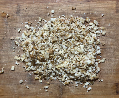 Грецкие орехи мелко порубите ножом. Несколько половинок я оставила для украшения. Чтобы орехи стали ароматнее и хрустящее, можете предварительно подсушить их на сухой сковороде.Шаг 7: