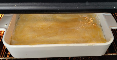 Для этого рецепта подойдет любая жаропрочная форма. Если используете силиконовую форму, то промазывать ее маслом или маргарином не нужно. А вот металлическую, керамическую или стеклянную посуду лучше слегка смазать растительным маслом, чтобы выпечка не пригорела.