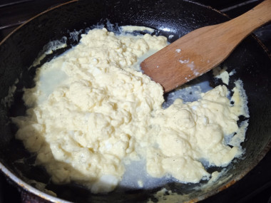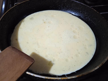 Перелейте яичную смесь на сковороду и подождите около 20 секунд, когда яйцо только-только начнет схватываться. Огонь должен быть средний, крышкой не накрывайте.