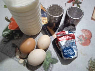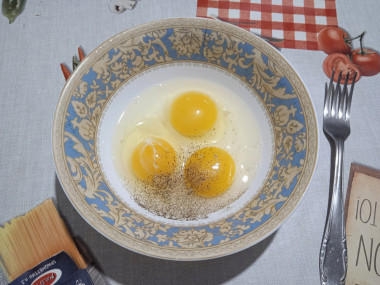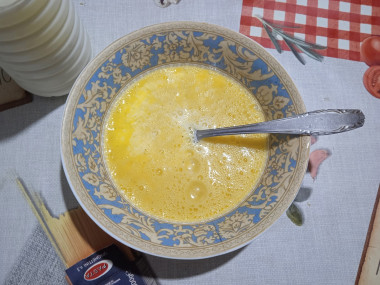 Яйца вымойте под проточной водой и вбейте их в миску. Перемешайте вилкой до соединения белка с желтком. Нужна просто однородная массы. Влейте молоко и добавьте соль. Снова перемешайте смесь до однородности.
