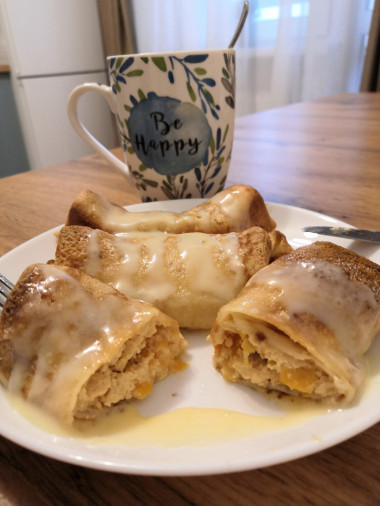Увы, у меня блины вышли невкусными, можно сказать несъедобными: резиновые, безвкусные, корочка не хрустящая, разжевать не получается. Творожная начинка вышла сухой и такой же безвкусной. Однако, если полить сладким джемом, то есть становится более терпимо. Возможно, у меня так получилось во многом потому, что я готовила по этому рецепту в первый раз, но все советы, данные в рецепте, я соблюдала. Пропорции также были чёткими. В любом случае, я не думаю, что это вина рецепта или автора, скорее здесь большую роль играет опыт. Но готовить даже второй раз я бы не стала.