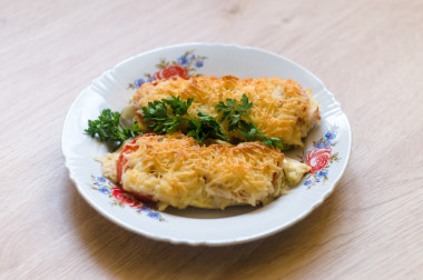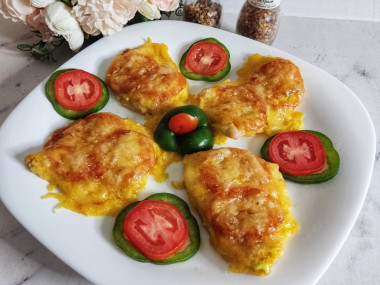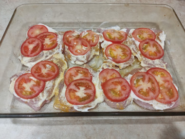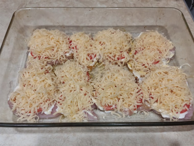 Филе нарезала на порционные кусочки,отбила и выложила филе в форму для запекания. Посолила, поперчила и смазала каждый кусочек майонезом. Помидоры нарезала на кружочки и выложила на филе. Сыр натерла на мелкой тёрке и посыпала отбивные.