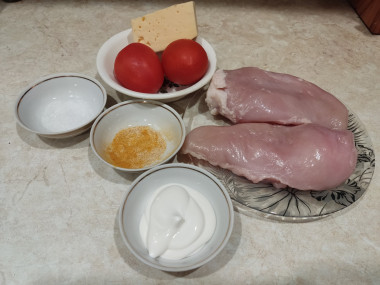 Как сделать отбивные из куриного филе в духовке? Подготовьте необходимые ингредиенты. Куриное филе берите охлажденное, которое не подвергалось заморозке. Иначе при размораживании мясо потеряет много сока, и отбивные получатся сухие. Помидоры можете использовать красные или желтые, главное, чтобы они были вкусные.