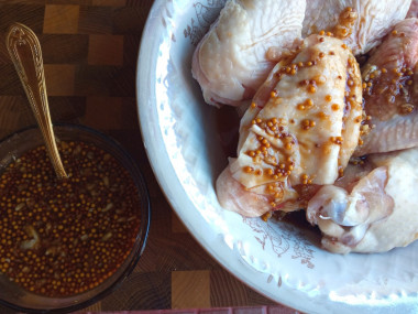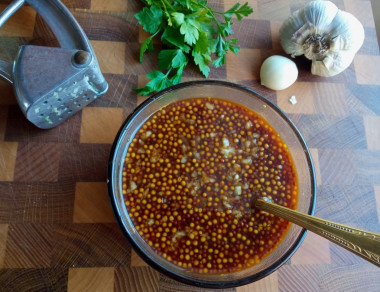 Также в маринад добавьте горчицу. Выбранный сорт горчицы влияет на вкус готового блюда. Так, используя, например, баварскую горчицу, готовое блюдо получится с определенными нотками сладости. Добавляя в маринад русскую горчицу (именно ее я использовала), блюдо получится более острым. Используя дижонскую горчицу, кроме свойственного этой горчице вкуса, готовое блюдо будет украшено зернышками.