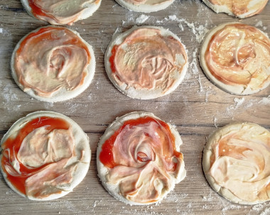 Выложите кружки теста на пергамент или смазанный маслом противень и смажьте их майонезом.