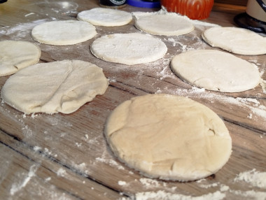 Заранее поставьте духовку на разогрев до 180 градусов. Слоеное тесто раскатайте в тонкий пласт, сделайте стаканом кружки.