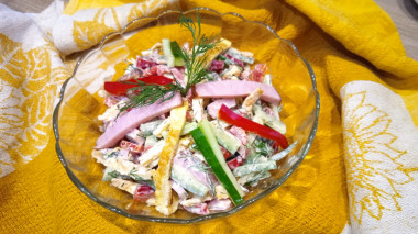 Простой и интересный рецепт. Яйца здесь используются не традиционно вареные, а в виде жареных блинчиков. За счет этого салат получается нежным, свежесть салату придает огурец и болгарский перец, пикантность копчености. Я такие салаты не солю, нам достаточно соли в колбасе и майонезе. Майонеза тоже кладу как можно меньше, сегодня обошлась одной ложкой. Просто дала салату минут 20 постоять. и свежие овощи отдали свой сок. Прекрасный вариант, когда «гости на пороге», да и просто как перекус или дополнение к ужину.