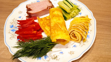 Как сделать салат с яичными блинчиками и копченой колбасой? Подготовьте необходимые ингредиенты. Яйца достаньте из холодильника заранее, чтобы они согрелись при комнатной температуре. Овощи предварительно помойте, обсушите. Майонез можно приготовить самостоятельно. Рецепты домашнего майонеза смотрите в статье по ссылке в конце рецепта.