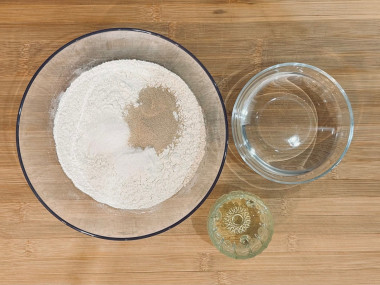 Муку просейте в миску. Благодаря просеиванию она насытится кислородом, и хлеб получится пышнее и воздушнее. О муке и её свойствах подробнее можно прочитать в отдельной статье, ссылка в конце рецепта. Всыпьте к муке все сухие ингредиенты — соль, сахар и дрожжи. Перемешайте их.