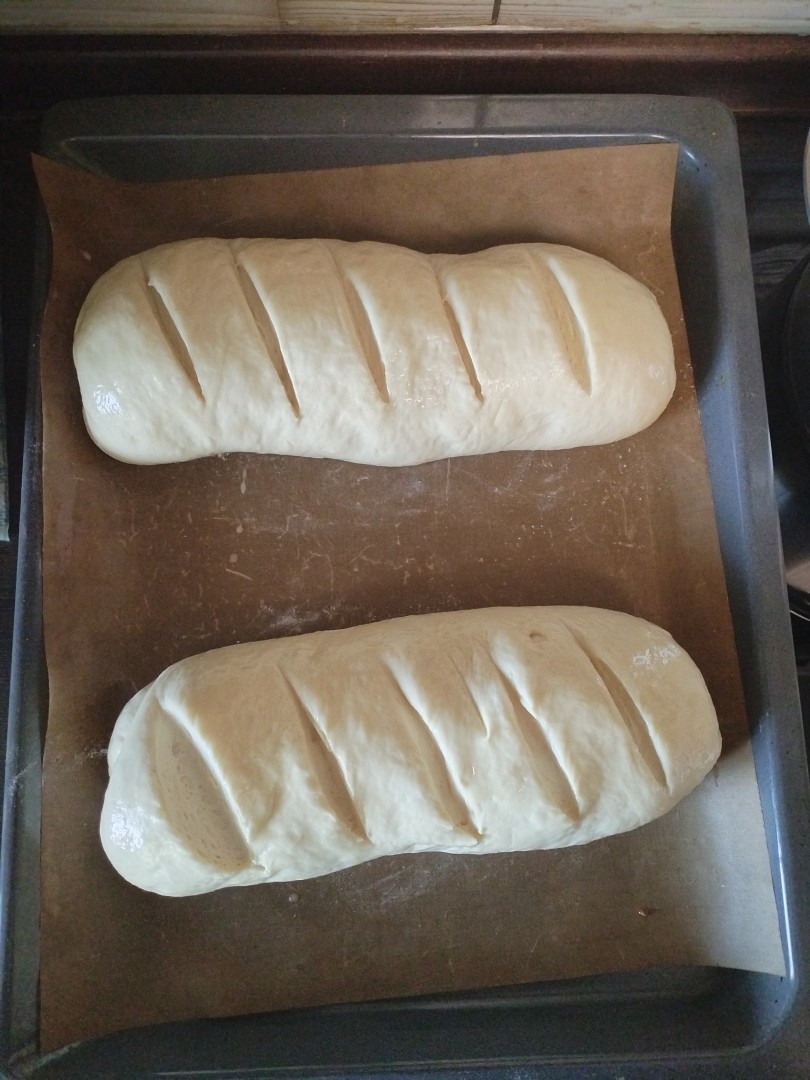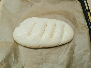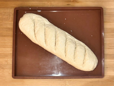 Через 20 минут смажьте батон водой или молоком, сделайте косые разрезы.