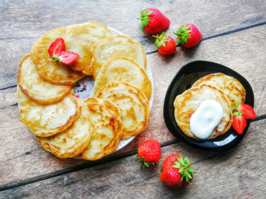 Готовые оладьи переложите на тарелку и подайте к столу со свежими фруктами. Приятного аппетита!