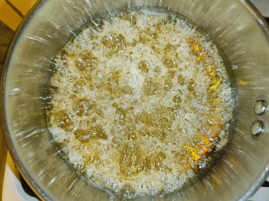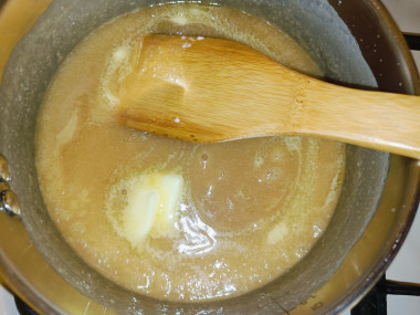 Как только сахарный сироп в сотейнике приобрел золотистый оттенок снимаем его с плиты.