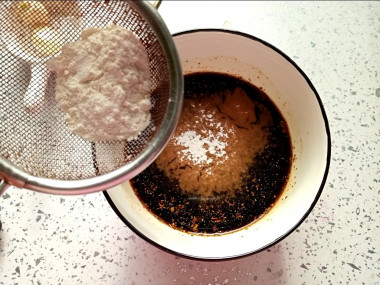 В маринад просейте муку через сито. Просеивать муку нужно обязательно. Так мука лучше соединится с соусом и не появится мелких комочков. С добавлением муки консистенция маринада практически не изменилась. Он такой же текучий без намека на вязкость. Однако если вы выльете маринад в форму к курице, под воздействием высоких температур и испарения лишней влаги, маринад будет постепенно густеть. И в дополнение к курице вы получите еще и вкусный густой соус.