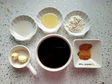 В мисочке соедините соевый соус, жидкий мед, белый винный уксус, карри, сухой чеснок, порошок имбиря и молотый перец. Сухой чеснок и молотый имбирь можете заменить на свежие. Чеснока понадобится 2 зубчика, а корня имбиря – 2 см. Их нужно очистить и натереть на мелкой терке. Чеснок также можно пропустить через пресс.