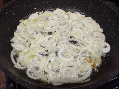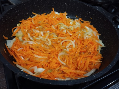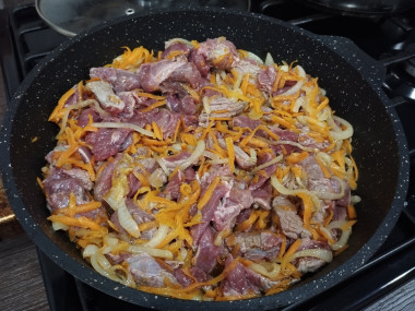 Говядину помыла,обсушила и порезала небольшими брусочками. Лук порезала полукольцами, морковь натерла на крупной тёрке. Сначала я обжарила лук до слегка золотистого состояния,затем добавила морковь.